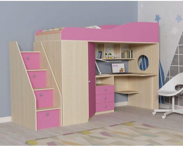Кровать-чердак Кадет-1 с универсальной лестницей Дуб молочный/Розовый