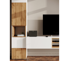Тумба ТВ Милана белый / дуб вотан сочетает в себе красоту и практичность, что делает ее идеальным вариантом мебели для украшения вашей современной комнаты.