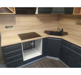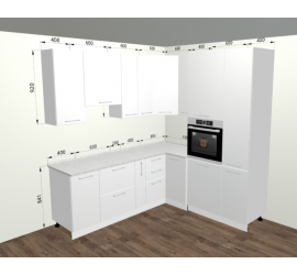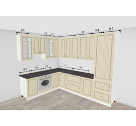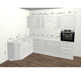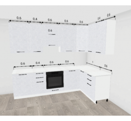 Размер кухонного гарнитура: Ширина левой стороны 3000 мм. Ширина правой стороны 1700 мм. Высота 2336 мм. Глубина 600 мм. (с учетом столешницы)