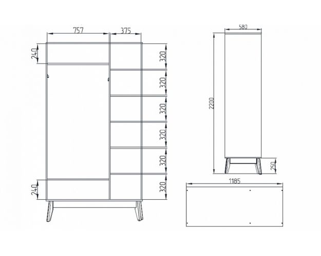 Распахнув две дверцы, вы обнаружите просторную секцию со штангой для одежды на плечиках, и две глубокие просторные полки (вверху и внизу шкафа) для хранения различных вещей и предметов, а открыв третью, боковую створку — получите доступ к вертикальному ряду достаточно глубоких и вместительных полок.